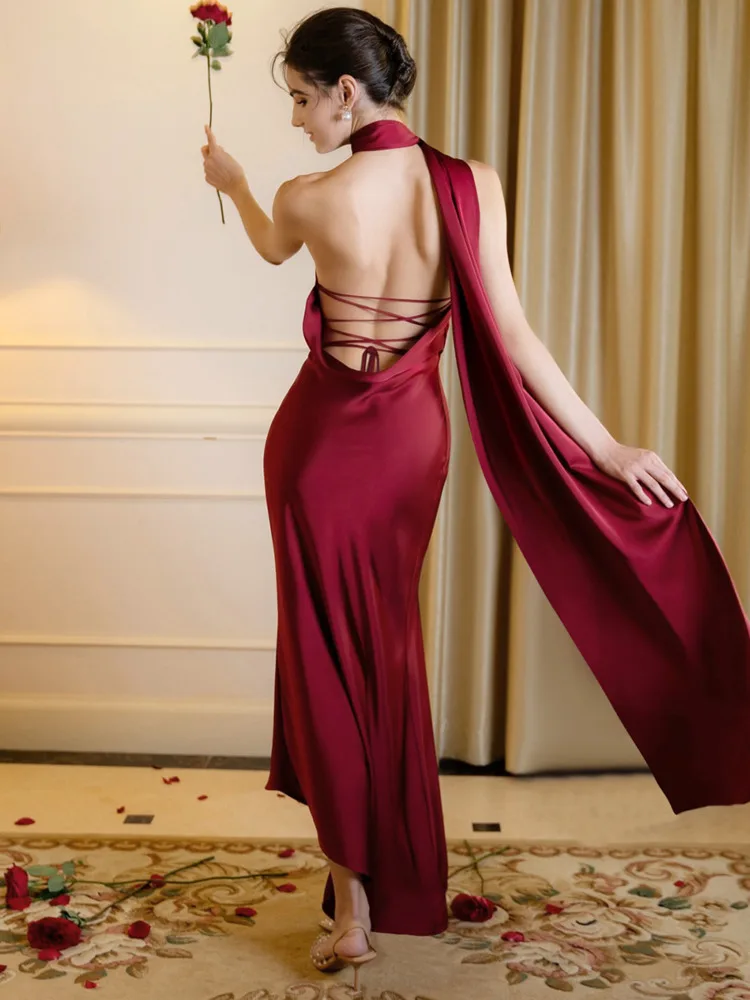 งานปาร์ตี้ งานเลี้ยงตอนเย็น เดรส For ผู้หญิง 2025 ฤดูร้อน New เซ็กซี่ เปิดหลัง สายเดี่ยว คอแขวน ริบบิ้น เดรส