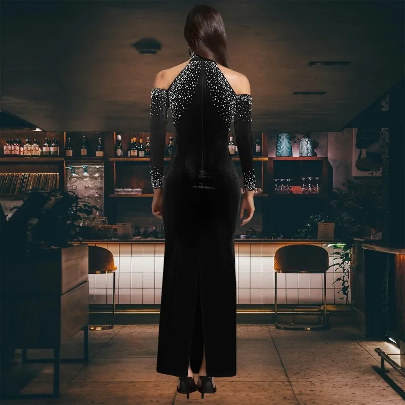 ยาว Sleeve คริสตัล รัดรูป ยาวคลุมข้อเท้า เดรส ฤดูใบไม้ร่วง วันหยุด งานเลี้ยงตอนเย็น วันเกิด Night งานปาร์ตี้ เซ็กซี่ เดรส