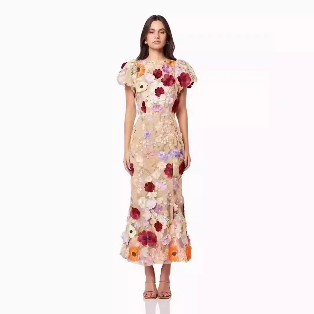 2025 New Round Neck 3D Floral Embroideสีแดง Bubble Sleeve ยาวคลุมเข่า Wrap เดรส