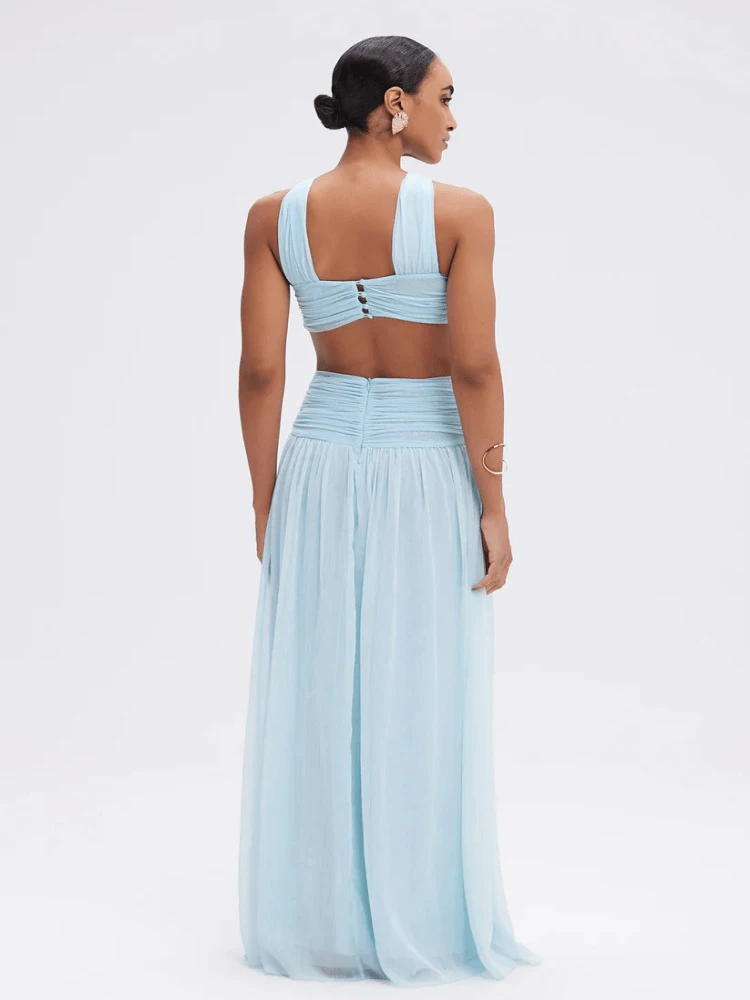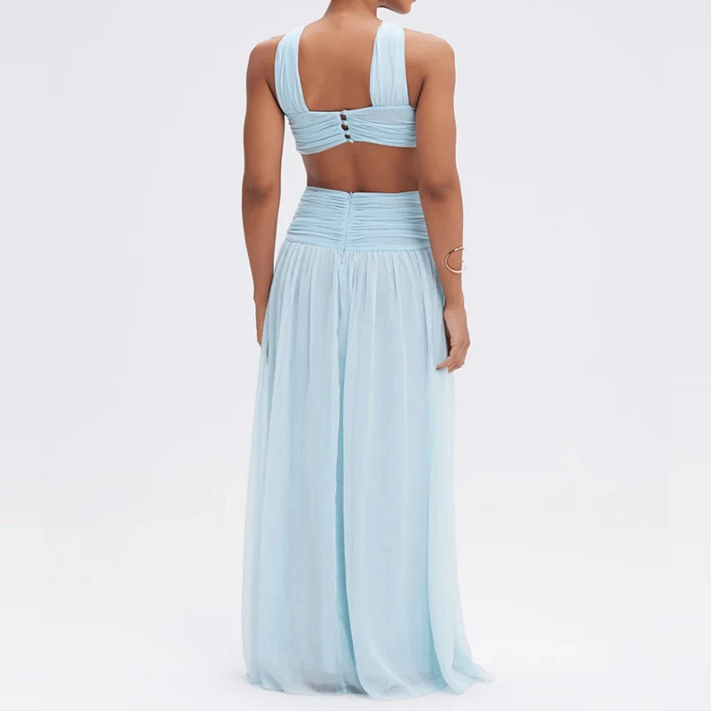 งานเลี้ยงตอนเย็น งานปาร์ตี้ เดรส ผู้หญิง’s สง่างาม ไร้แขน พับผ้า สีน้ำเงิน ยาว เดรส