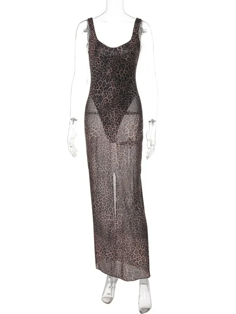 ยาวคลุมข้อเท้า เดรส ผู้หญิง Fashion Spaghetti สายเดี่ยว ไร้แขน เปิดหลัง รัดรูป See Through Print เดรส